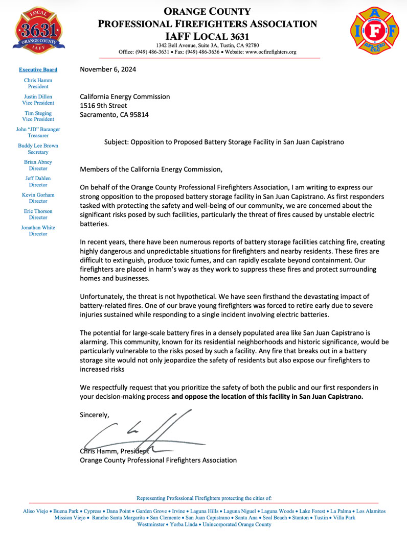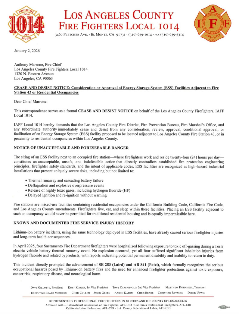 Unions representing thousands of fire fighters are standing up for communities and first responders. LA County (Local 1013) and Orange County (Local 3631) have issued strong opposition to placing these facilities near homes and fire stations. See their letters below.